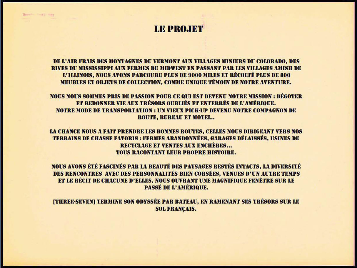 Après 9.000 miles parcouru à travers les Etats-Unis et plus de 800 meubles et objets de collection recoltés, [THREE-SEVEN] termine son odyssée à Paris pour six semaines seulement.